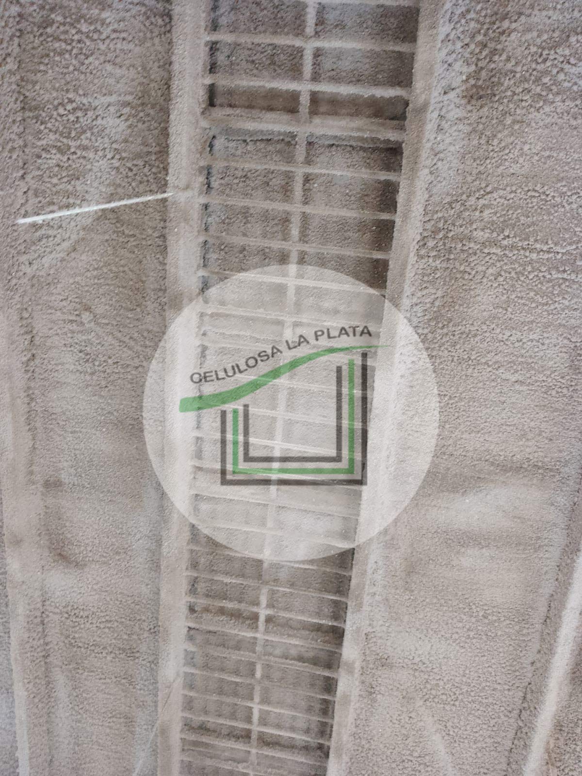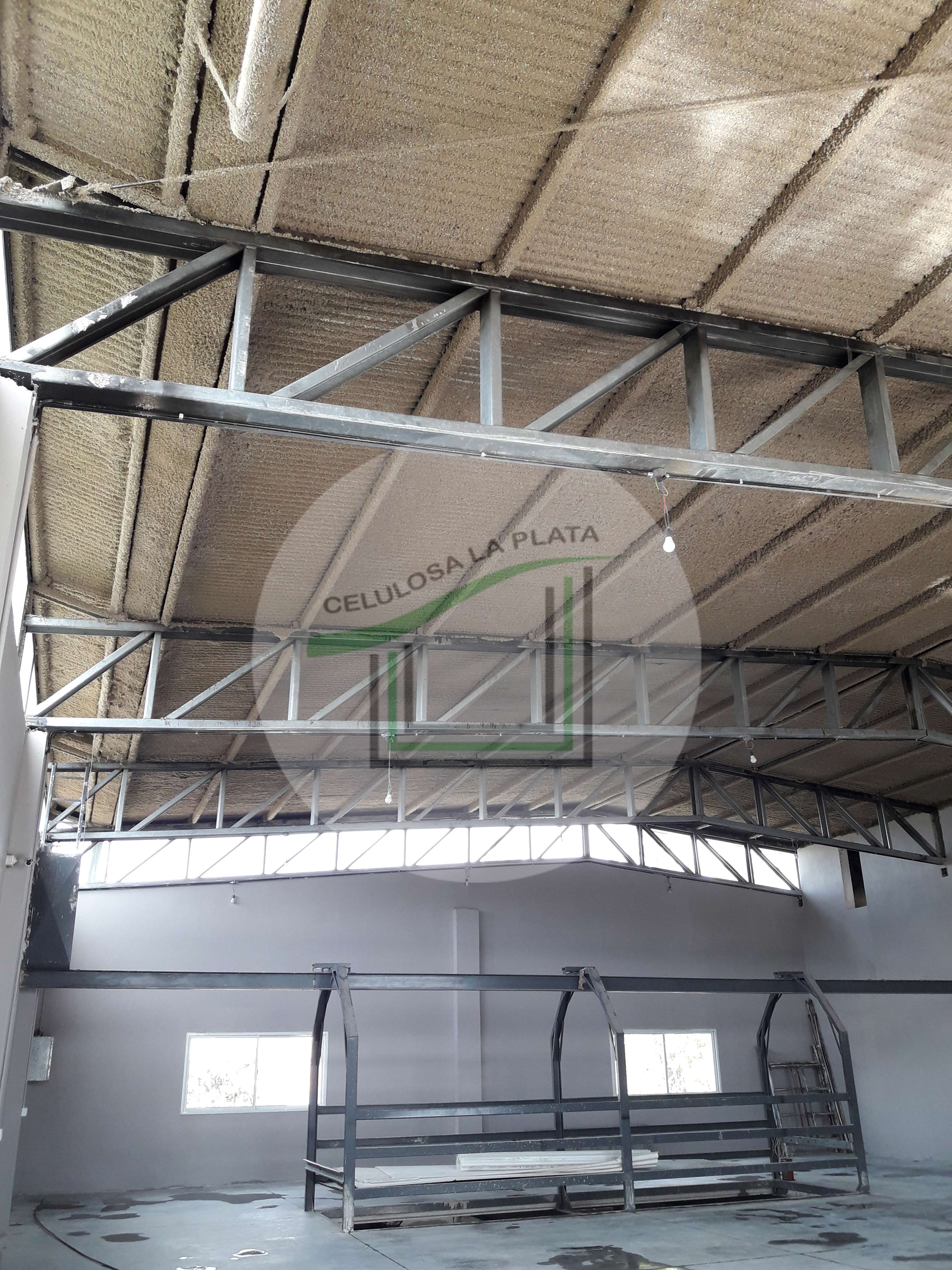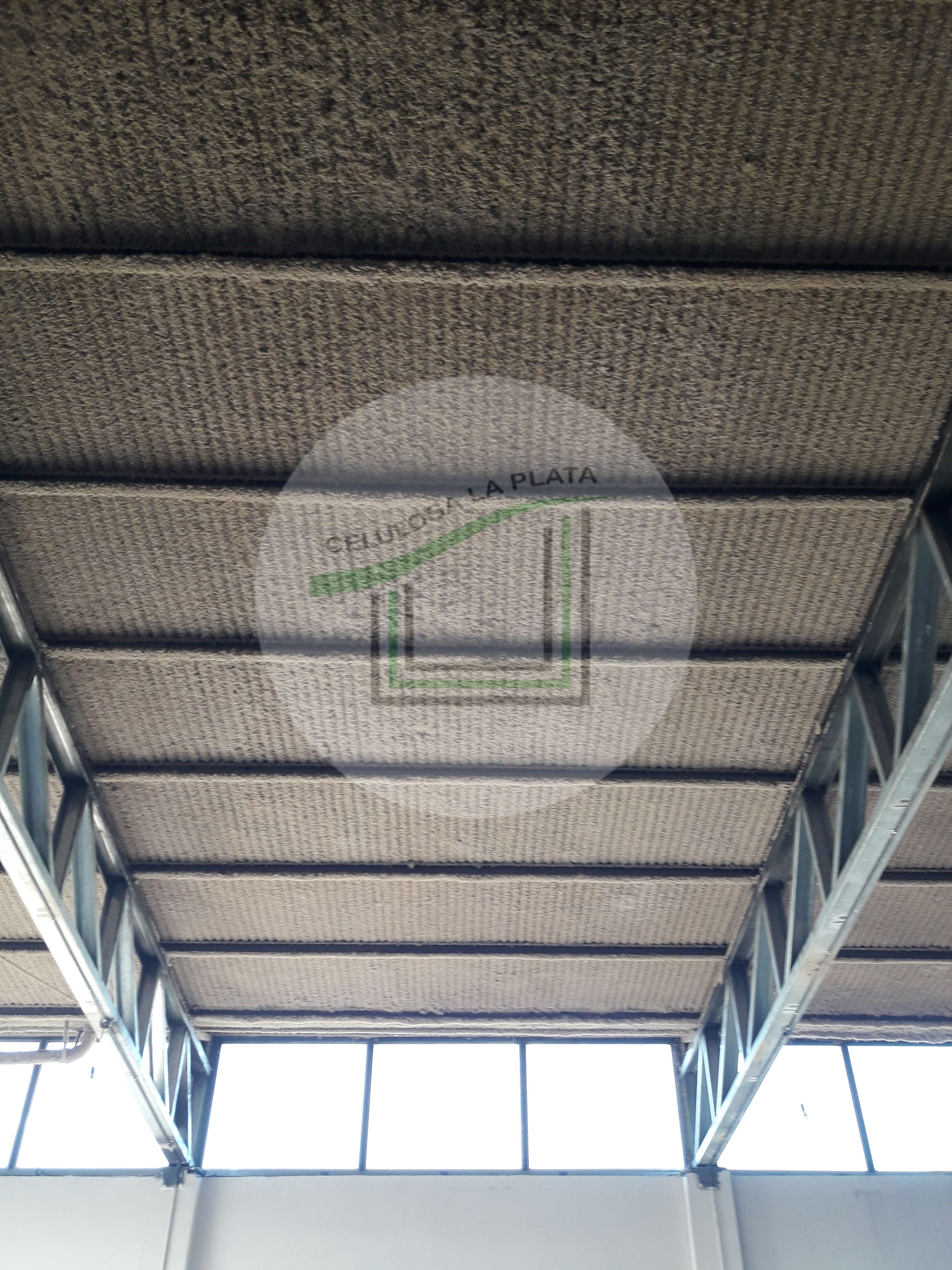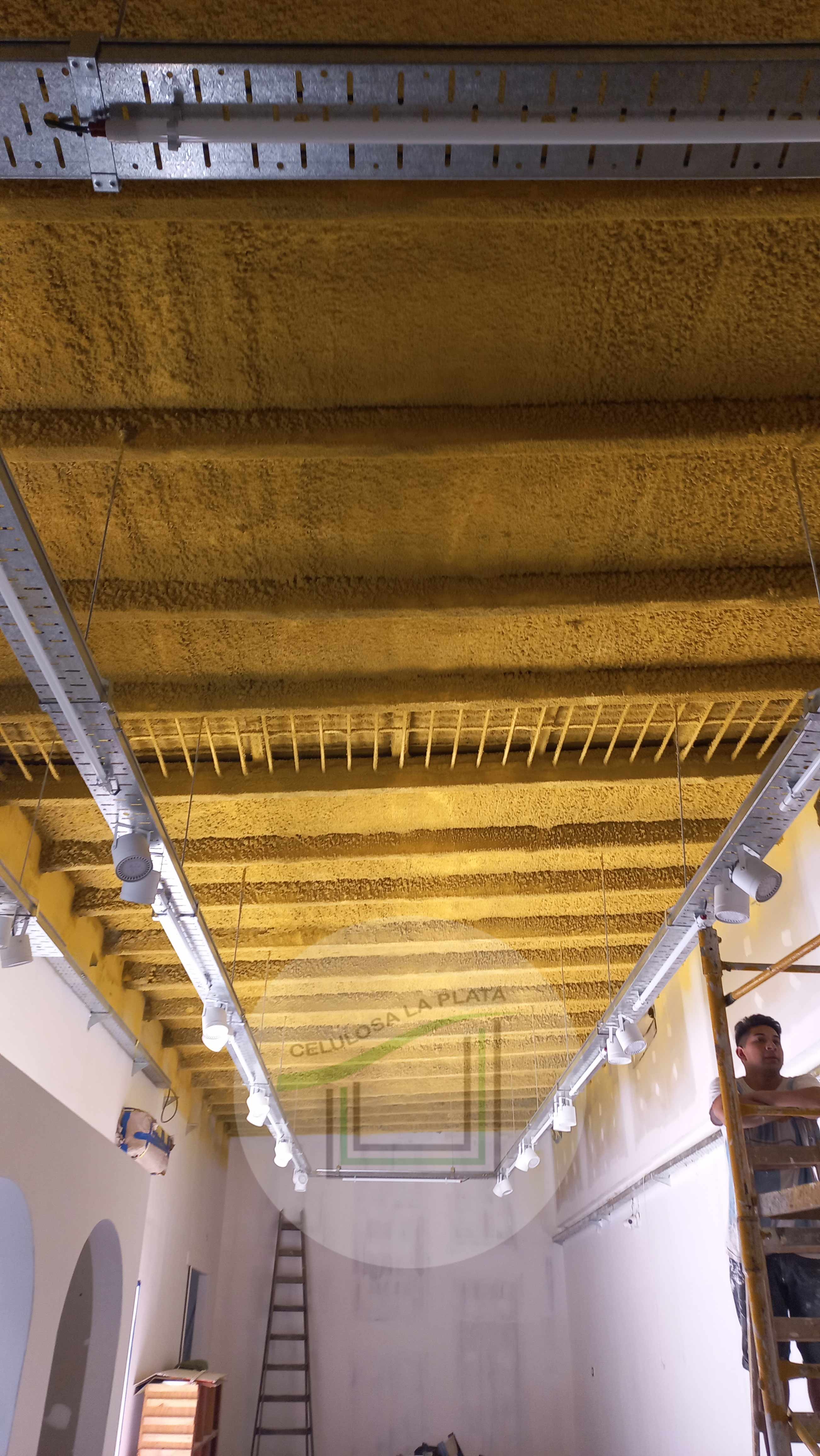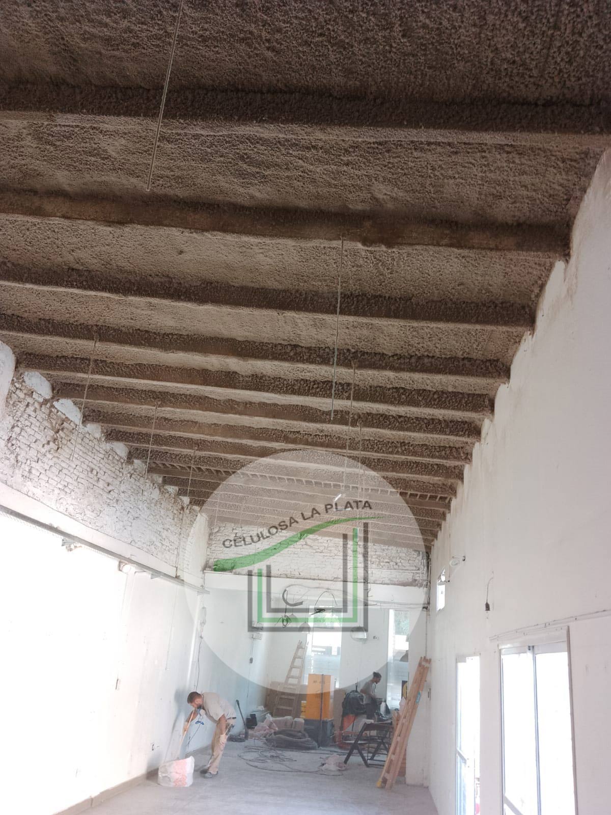 Instalación de celulosa proyectada para Cocoliche, un local de ropa en La Plata con terminación final de celulosa pintada para dejar a la vista.