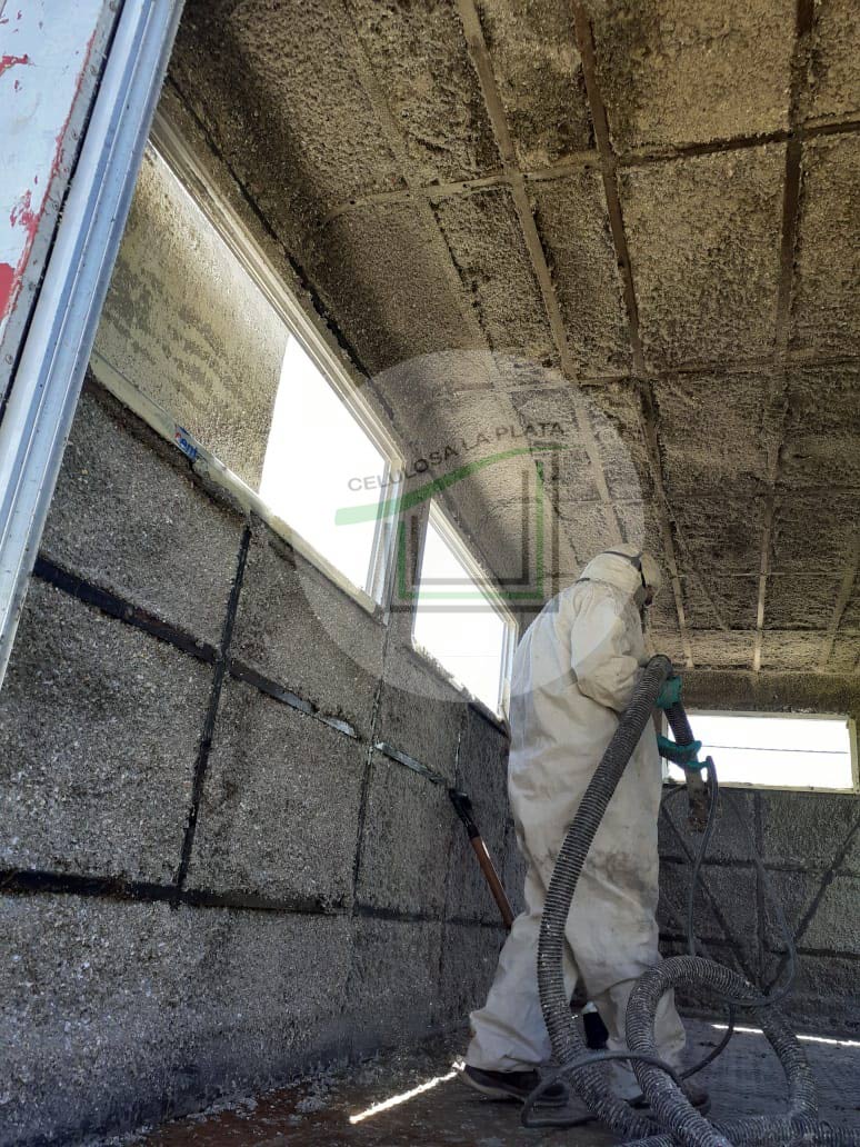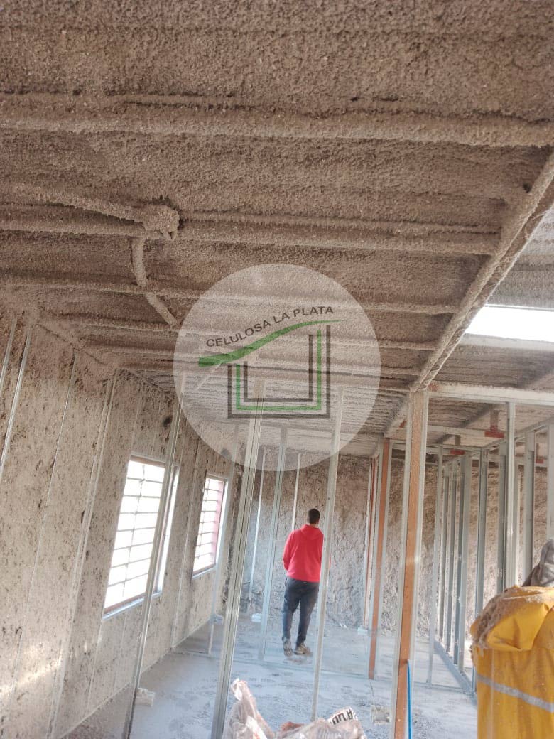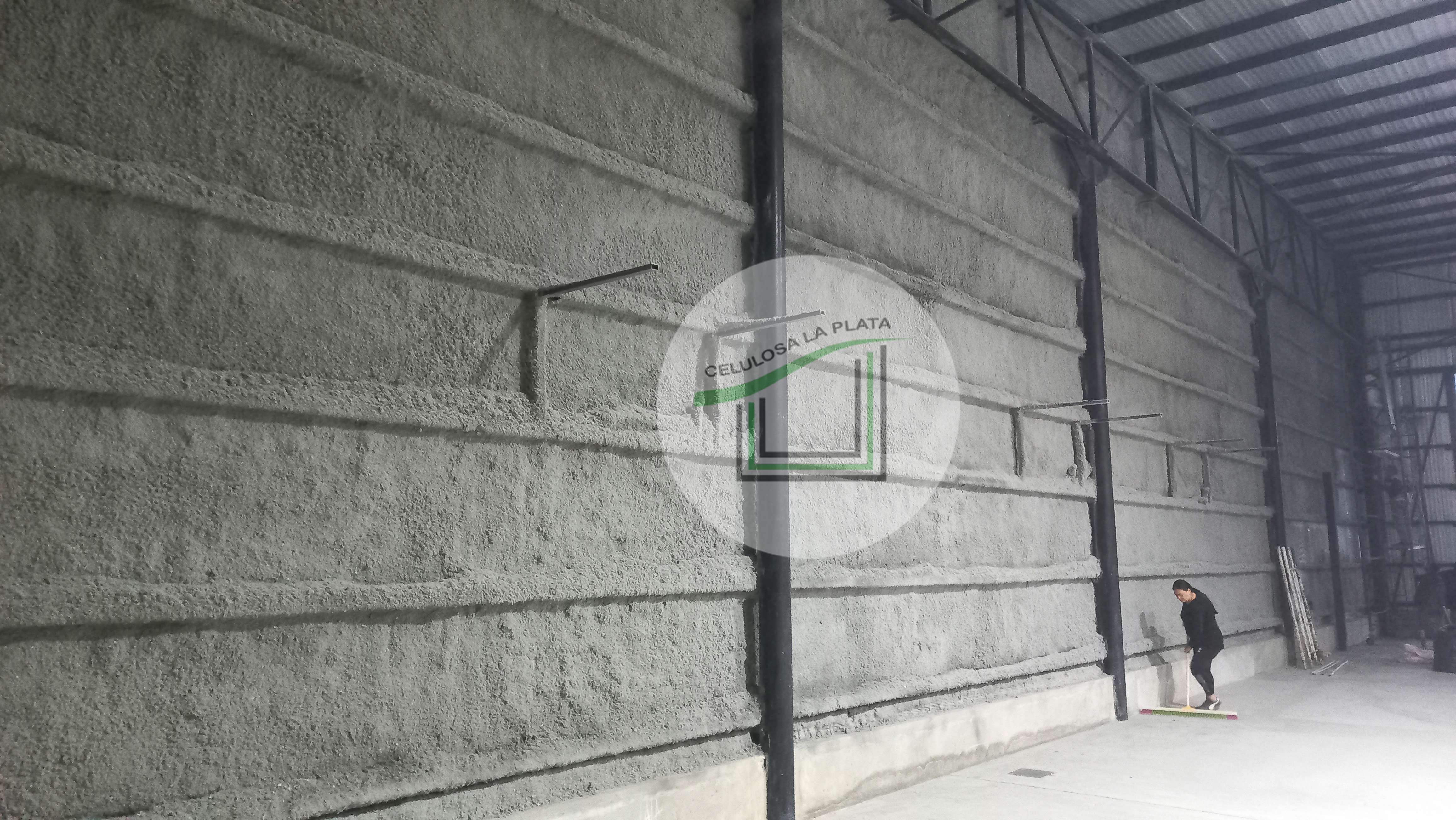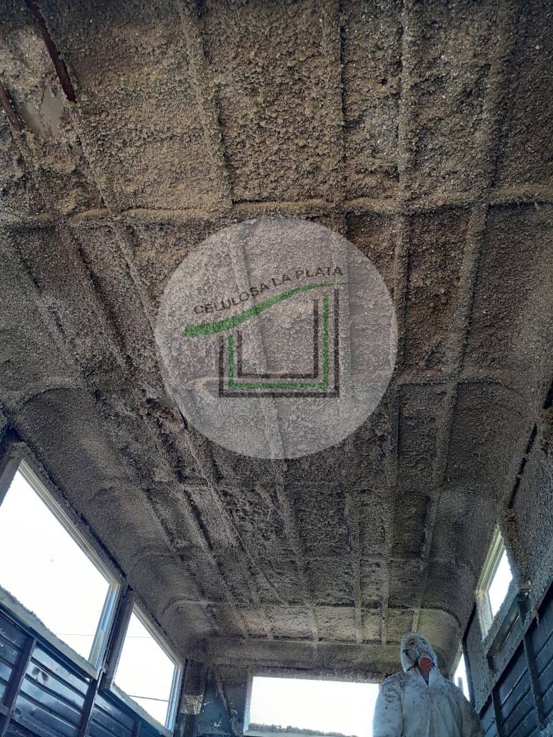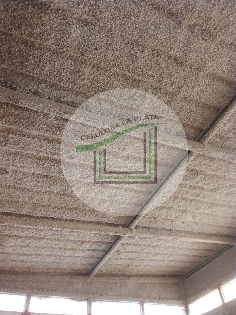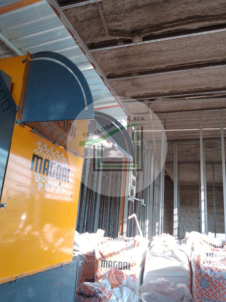 Instalación de celulosa proyectada para Cocoliche, un local de ropa en La Plata con terminación final de celulosa pintada para dejar a la vista.