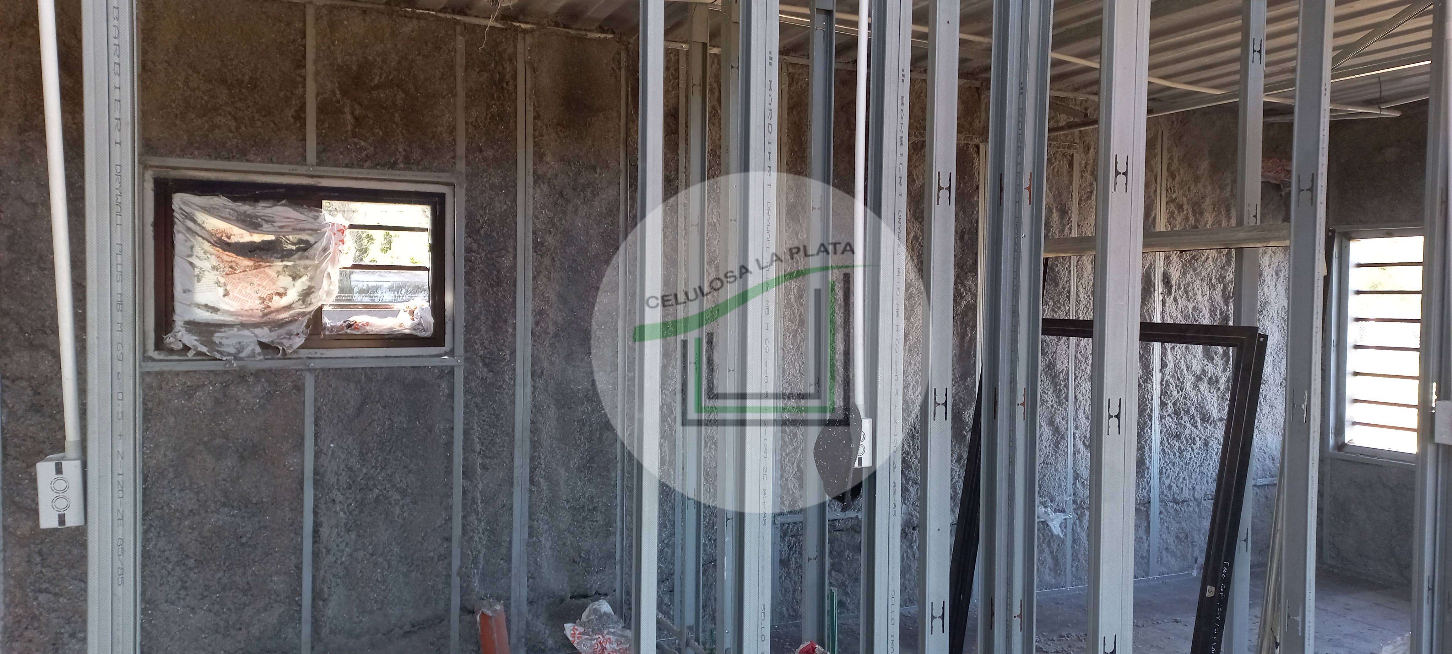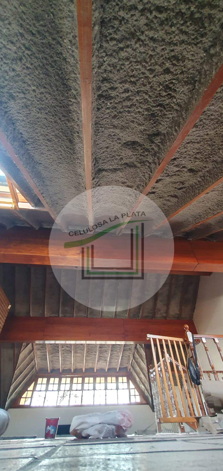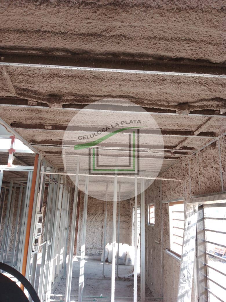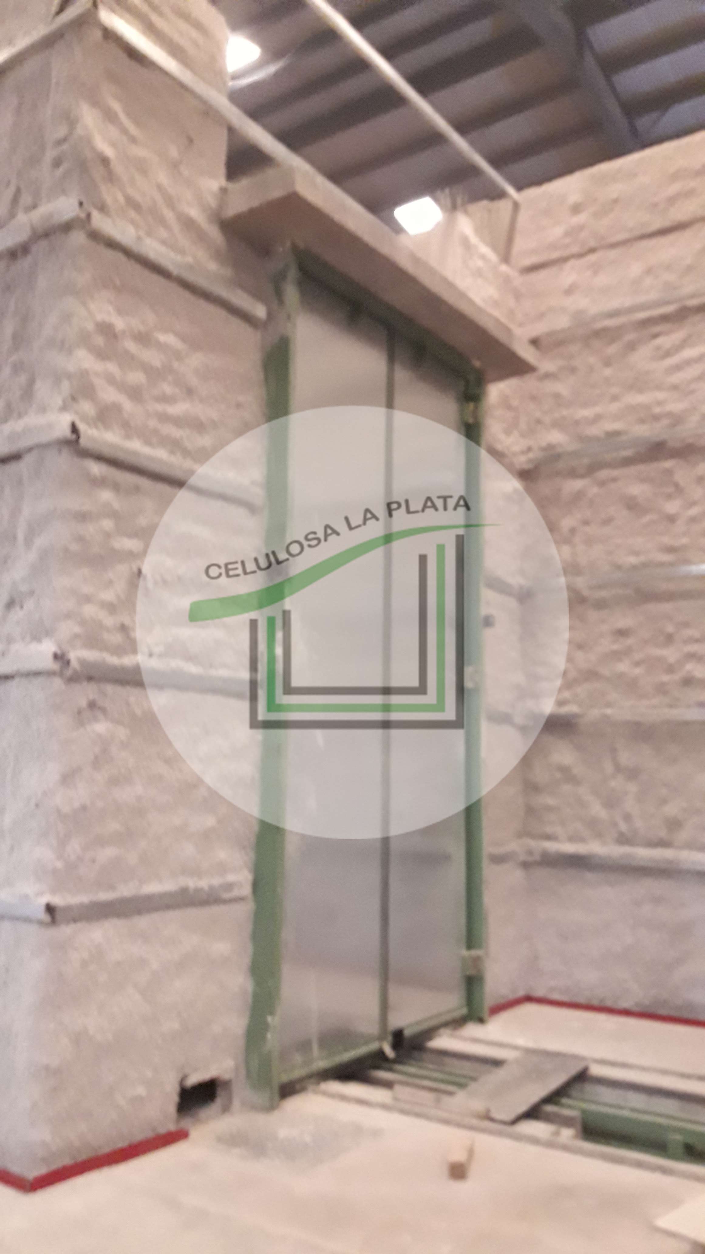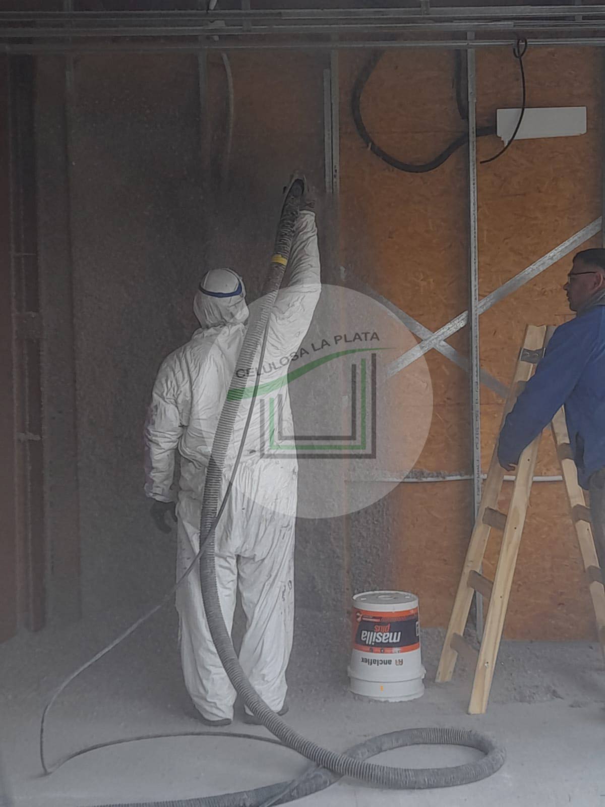 Instalación de celulosa proyectada para Cocoliche, un local de ropa en La Plata con terminación final de celulosa pintada para dejar a la vista.